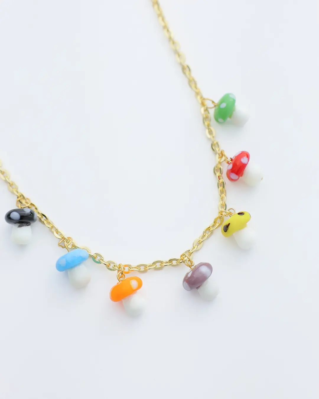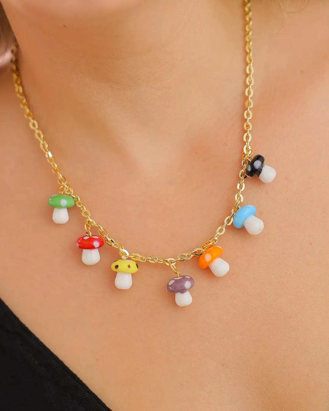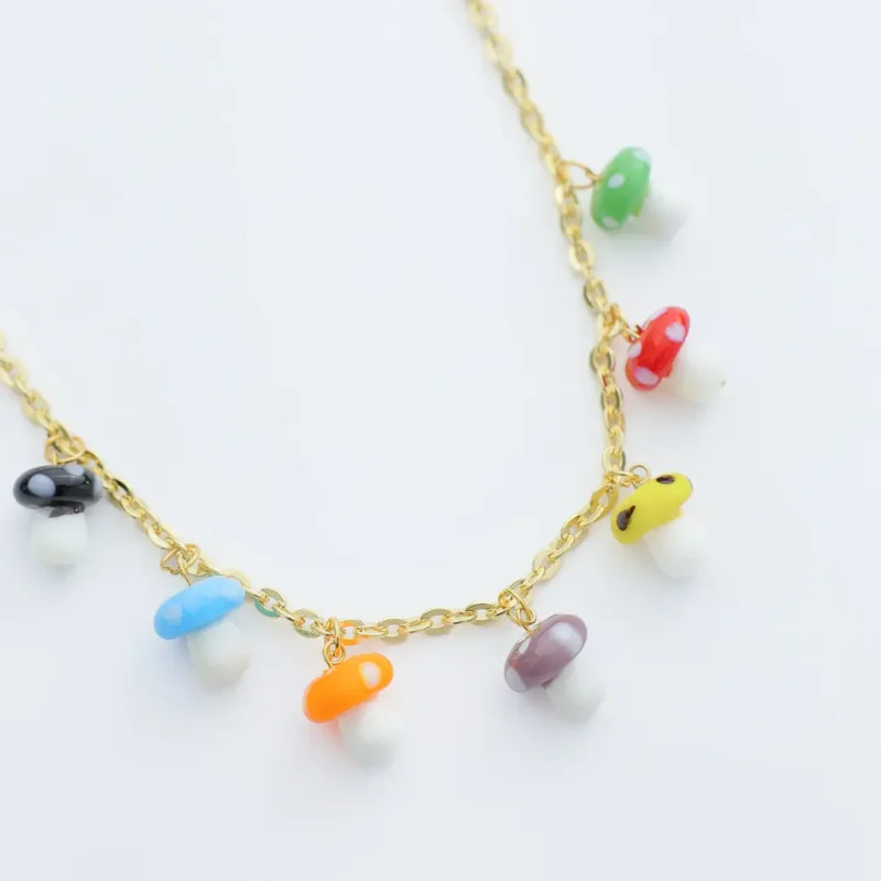 Collar con hongos en vidrio cadena con baño de oro de 24k